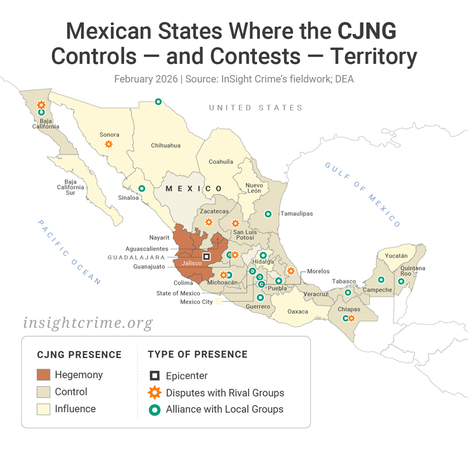 - 13‘5 CJNG Hotspots to Watch After El Mencho’s Killing in Mexico’, InSight Crime, 24 February 2026.
