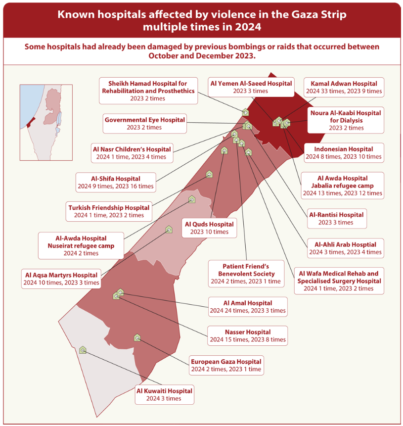All parties to armed conflicts are obligated to respect and protect medical personnel and units in all circumstances.32Arts 19(1) and 24, Geneva Convention I; Arts 18(1) and 20(1), Geneva Convention IV; ICRC, Customary IHL Rule 25: ‘Medical Personnel’, and Rule 28: ‘Medical Units’. By mid-August 2025, the World Health Organization (WHO) had documented 772 Israeli attacks against healthcare facilities since the beginning of military operations in the Gaza Strip in October 2023. Of these, 115 occurred between 1 January and 10 August 2025 (with the highest number recorded in May). The attacks killed fifty people and injured a further 119.33OCHA, ‘Humanitarian Situation Update #315: Gaza Strip’, 21 August 2025. Attacks in WHO data refer not only to the use of force, but also obstructions and searches. WHO, ‘Health Cluster – Occupied Palestinian Territory – Health Attacks’, Last updated 17 August 2025. WHO’s Health Cluster also listed 210 attacks impacting medical vehicles since the beginning of hostilities in the Gaza Strip through to the middle of August 2025.34WHO, ‘Health Cluster – Occupied Palestinian Territory – Health Attacks’, Last updated 17 August 2025.