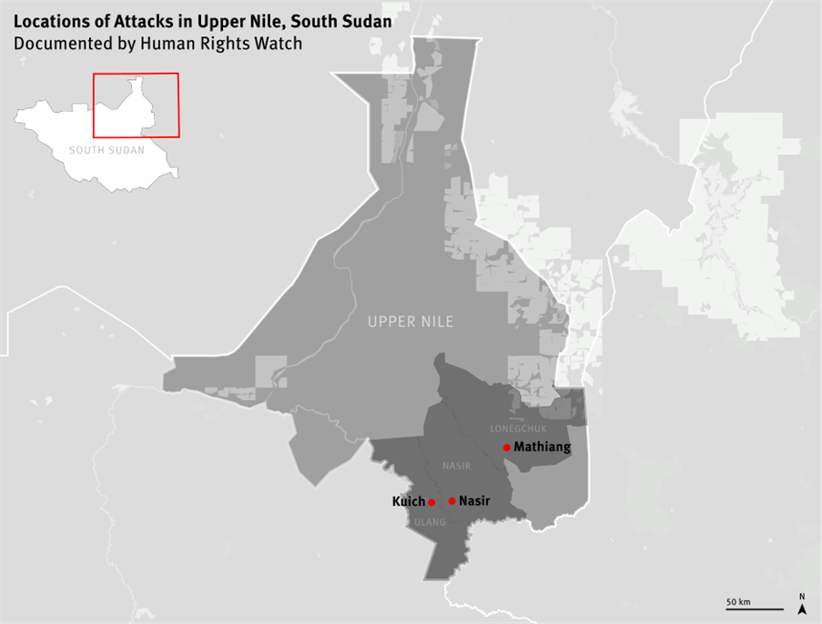 On 3 May 2025, two helicopter gunships bombed the Médecins Sans Frontières (MSF) hospital at Old Fangak in Jonglei state; this was the only major medical facility in the area, serving more than 40,000 people. The strike killed at least seven civilians and injured many more, including medical staff; it also destroyed the hospital pharmacy and all the medicines held there.14MSF, ‘South Sudan: MSF strongly condemns the deliberate bombing of our hospital in Old Fangak, Jonglei state’, 4 May 2025; Office of the UN High Commissioner for Human Rights (OHCHR), ‘Targeting of MSF hospital may constitute a war crime, says UN Commission, urges immediate halt to hostilities in South Sudan’, Press release, 6 May 2025. In condemning the ‘calculated, unlawful attack on a protected medical facility’, the UN Commission on Human Rights in South Sudan noted that the operation followed a public statement by the SSPDF that it would carry out ‘punitive’ aerial and riverine operations if the SPLM/A-IO did not immediately release certain vessels allegedly hijacked at Adok Port in Leer County.15OHCHR, ‘Targeting of MSF hospital may constitute a war crime, says UN Commission, urges immediate halt to hostilities in South Sudan’. See also Radio Tamazuj, ‘SSPDF Chief orders SPLA-IO to release detained barges, boats’, 2 May 2025. The Commission on Human Rights in South Sudan is an independent body mandated by the UN Human Rights Council that was established in 2016.